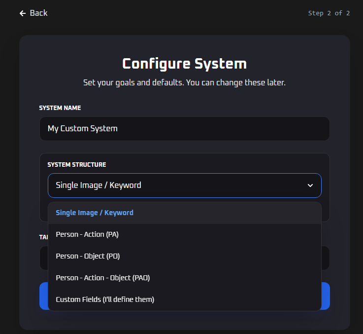 This is one of the details I really like. When you create a custom system, you’re not locked into a preset structure. Traditionally you have things like PAO (Person, Action, Object) or PO — two or three fields with fixed names. Now you can define up to 4 fields you want and name them whatever you want.